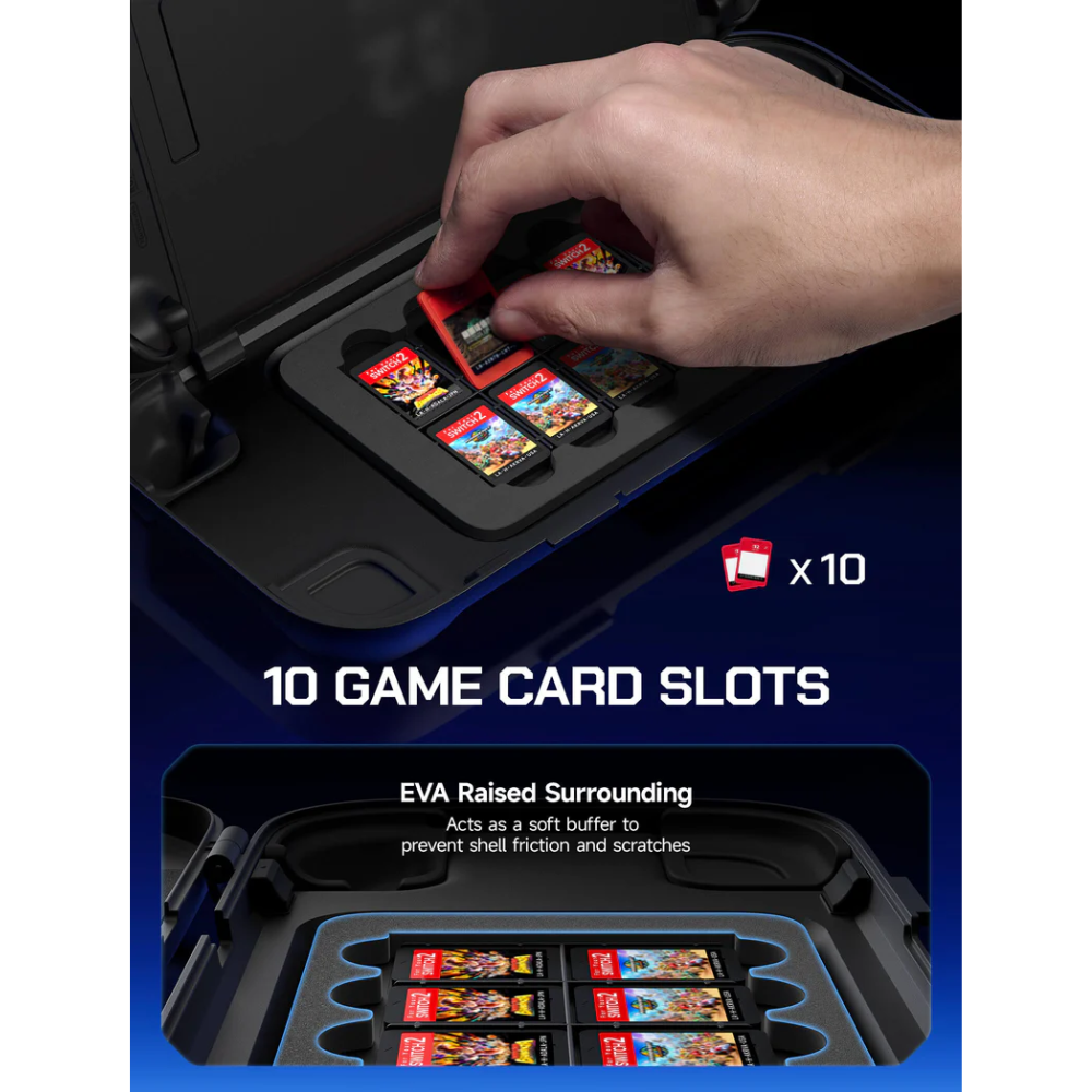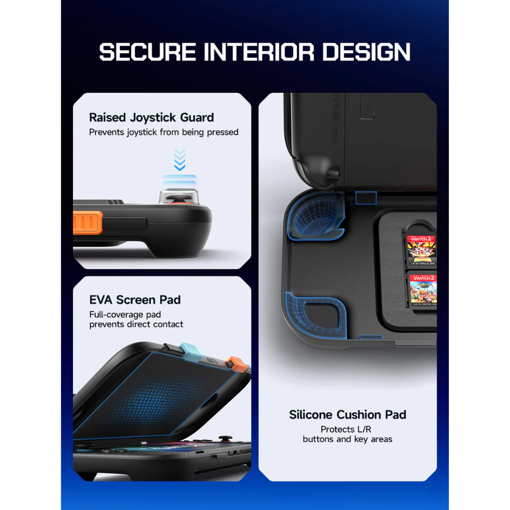 Key Features - Heavy-Duty Protection Built with a 2.5 mm reinforced hard shell that’s tougher than many regular cases — great for travel, outdoor use, or if you drop your Switch 2 often. - Secure Locking Design The case has dual-lock latches that keep it firmly closed inside backpacks or bags so the console doesn’t accidentally open. - Shock-Absorbing Corners Soft bumpers on the corners help absorb impact when dropped and reduce damage. - Built-In Storage Space inside for up to 10 game cards and a special area that protects the joysticks. - Charge Without Removing There’s a cut-out around the USB-C port, so you can plug in and charge your Switch 2 without opening the case. - Snug Fit Precision-molded to the exact shape of the Nintendo Switch 2 so it doesn’t rattle or shake around inside.
