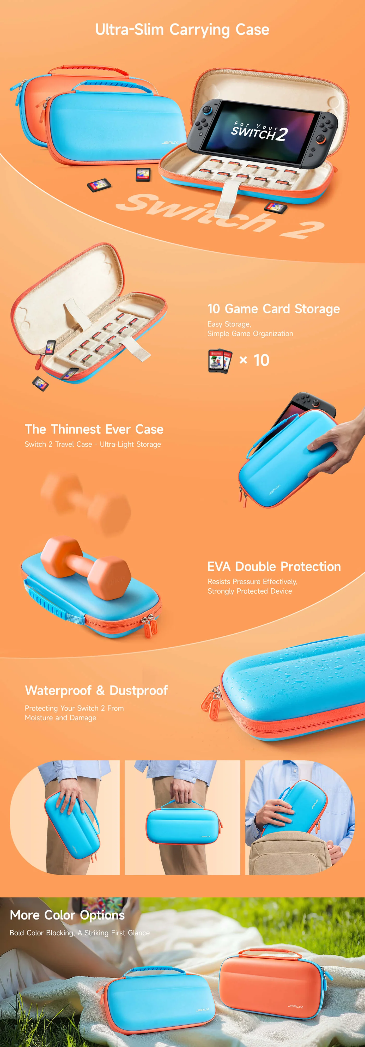 - 【Perfect Fit】JSAUX case is custom-designed for Switch 2, with an EVA inner lining that perfectly conforms to the console. Features dedicated storage slots to securely hold your Switch 2 console and up to 10 game cartridges, ensuring your favorite games are always within easy reach.